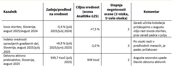 Skupna vrednost industrijske proizvodnje je v avgustu 2025 v Sloveniji po prvi oceni po desezoniranih podatkih, v primerjavi s predhodnim mesecem, upadla za pol odstotka. Padec je izviral iz manjše proizvodnje v oskrbi z električno energijo, plinom in paro (za šestino) in v rudarstvu (-1,3 %). V predelovalni dejavnosti je bila prisotna skromna, 0,3-odstotna rast proizvodnje, do česar je prišlo po znižanju ocene julijske rasti (+0,7 %; prva ocena: +1 %). Avgustovska in julijska rast nakazujeta na vrnitev k zmerni rasti proizvodnje v predelovalni dejavnosti v 3. četrtletju, po padcu v 1. in 2. četrtletju, kar je v skladu z manjšim izboljšanjem ocene izkoriščenosti proizvodnih zmogljivosti v 3. četrtletju.