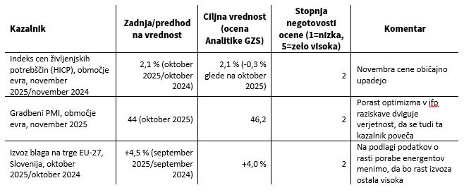 Poraba električne energije v Sloveniji je bila v oktobru 2025 medletno večja za 5 %, k čemer je prispevala rast porabe pri gospodinjstvih (za desetino), kar je posledica hladnejšega vremena, kot tudi rasti porabe pri poslovnih subjektih (+2,7 %). V prvih 10-ih mesecih 2025 je poraba električne energije nekoliko upadla (-0,7 %), k čemer je prispeval padec porabe med poslovnimi subjekti (za odstotek), medtem ko je ta pri gospodinjstvih rahlo porasla (+0,2 %). Pregled porabe električne energije po SKD dejavnostih sicer razkriva, da so se v predelovalni dejavnosti v prvih 10-ih mesecih soočali s padcem porabe (-1,3 %). Tega je sicer omilila oktobrska rast porabe (+2,5 %), ki je bila najvišja v zadnjih 10-ih mesecih. Poraba zemeljskega plina pri vseh odjemalcih je bila v prvih 10-ih mesecih višja za desetino, od tega v oktobru kar za polovico, kar je po naši oceni predvsem posledica večje porabe v energetiki za proizvodnjo električne energije in za namen daljinskega ogrevanja ob dokaj zgodnjem začetku ogrevalne sezone.