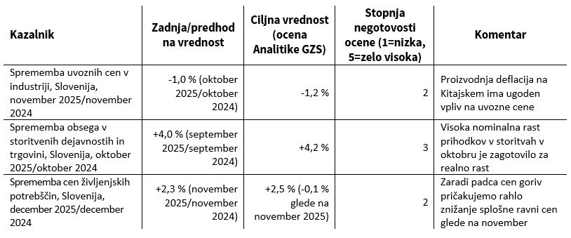 Gospodarska klima se je decembra v Sloveniji na mesečni ravni šesti mesec zapored izboljšala, in sicer je porasla za 0,2 o. t., ter je s tem dosegla najvišjo raven po juniju 2022. V zadnjem četrtletju 2025 je gospodarska klima porasla za 2 o. t., k čemer je prispevalo višje zaupanje v trgovini na drobno (+10 o. t.), gradbeništvu (+3 o. t.), v storitvenih dejavnostih in med potrošniki (oboje +1,7 o. t.) ter v predelovalnih dejavnostih (+1,3 o. t.). V zadnjih razpoloženje še naprej ostaja pesimistično, vendar je pesimizem najmanjši po 2. četrtletju 2022. K izboljšanju na ravni 3-mesečnih drsečih sredin (+0,7 o. t.) je pripomoglo izboljšanje zaupanja v trgovini na drobno (+3,3 o. t.), predvsem zaradi višje ocene trenutne prodaje (+5,7 o. t.) in pričakovane prodaje (+4 o. t.). Sledi rast zaupanja v storitvenih dejavnostih (+1,3 o. t.), med potrošniki in v predelovalnih dejavnostih (oboje +0,3 o. t.). V zadnjih so porasla pričakovanja o proizvodnji v prihodnjih treh mesecih (+2 o. t.), ki so bila najvišja po juliju 2022, kljub temu pa so podjetja še naprej poročala o pomanjkanju naročil. Zaupanje v gradbeništvo je minimalno upadlo (-0,3 o. t.), vendar je ostalo blizu novembrskega 21-mesečnega vrha. Vir: Statistični urad RS