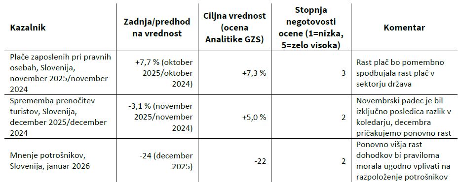 V novembru je bilo v Sloveniji približno 945 tisoč delovno aktivnih oseb, od tega je bilo 840 tisoč oseb zaposlenih in 105 tisoč oseb samozaposlenih. To glede na predhodni mesec predstavlja rast, in sicer za 700 oseb, ki je bila popolnoma v skladu z našimi pričakovanji. V novembru 2025 je bilo število delovno aktivnih glede na enako obdobje leta 2024 nižje za 3,5 tisoč. Število delovno aktivnih je še naprej najbolj naraščalo v pretežno javnih storitvah (+4,5 tisoč oseb), medtem ko so se s padcem soočali v industriji (-3,7 tisoč oseb), kjer ta traja že zadnjih 12 mesecev in ključno prispeva k zmanjšanju števila delovno aktivnih. Sledi padec v trgovini in gradbeništvu (oboje tisoč oseb manj), kmetijstvu (-800 oseb), drugih poslovnih storitvah (-700 oseb) in IKT dejavnosti (-500 oseb). Padec v zadnjih izvira iz založništva (-600 oseb), medtem ko se je zmerna rast števila delovno aktivnih nadaljevala v računalniškem programiranju (+120 oseb). Vir: Statistični urad RS